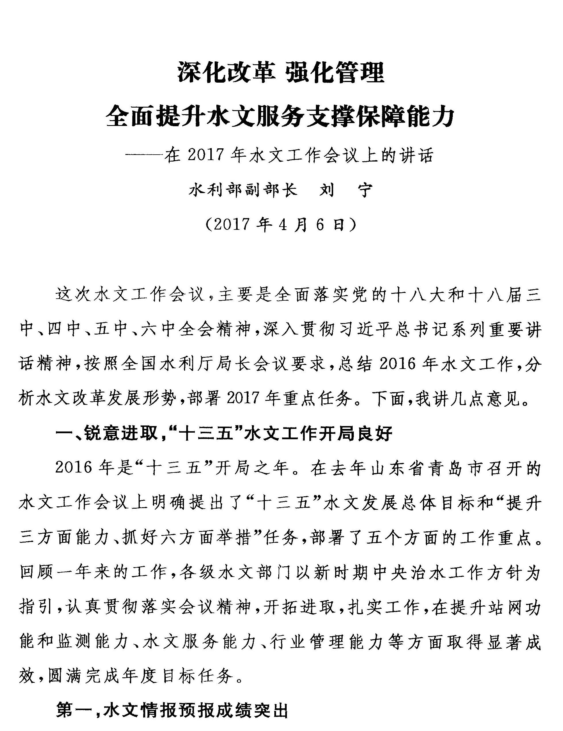 水利部副部长刘宁在2017年全国水文工作会议上的讲话